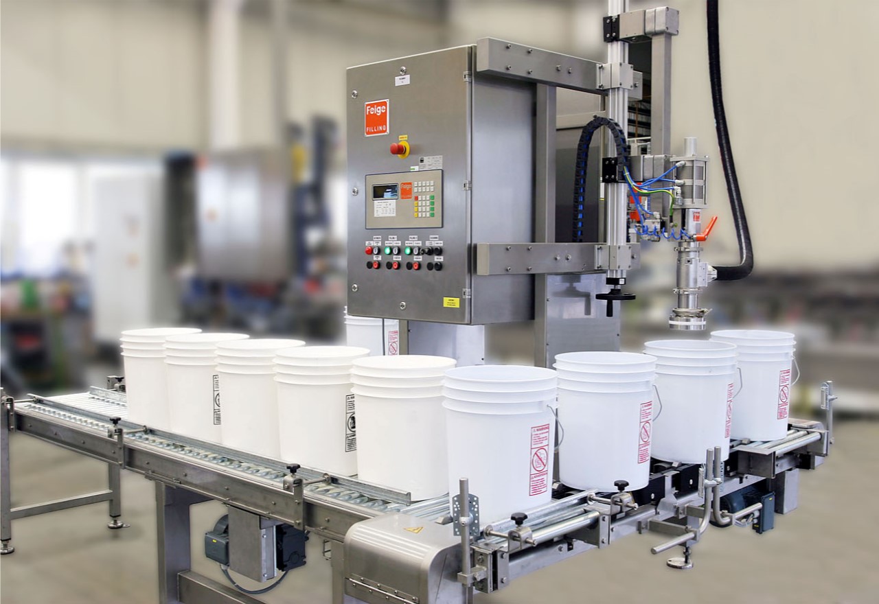 FEIGE可提供半自动及全自动提桶灌装设备,灌装重量可达60kg,灌装速度可达30桶/分钟。客户可根据自身需求选择多种附件以扩展功能,并附带关盖与压盖功能。适用于易产生泡沫的产品灌装,或在根据ATEX定义的危险区域内使用。